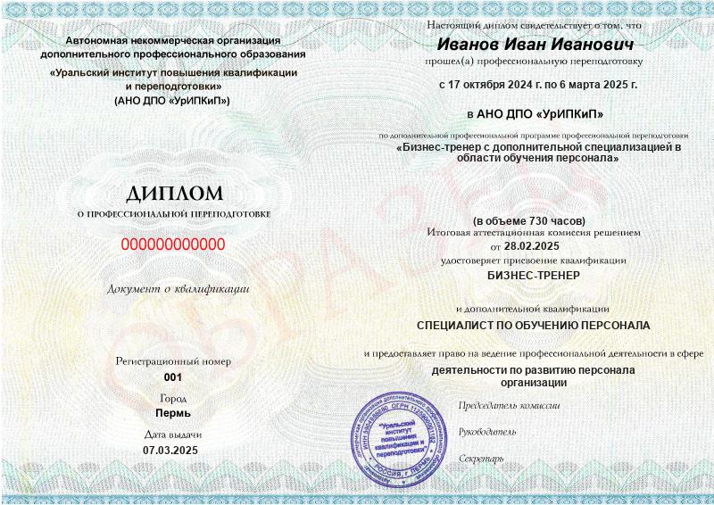 На курсе вы получите диплом о профессиональной переподготовке с присвоением сразу двух квалификаций: Специалист по обучению персонала и бизнес-тренер.