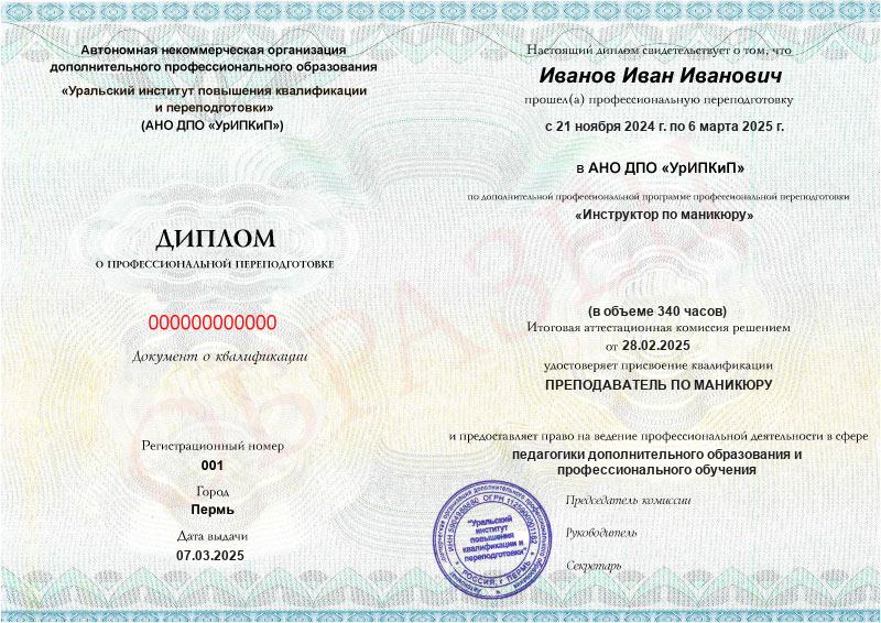 Да, дипломы и удостоверения оформляются в соответствии с действующим законодательством РФ. Документы печатаются на специальных бланках, заверяются печатью АНО ДПО «УрИПКиП».