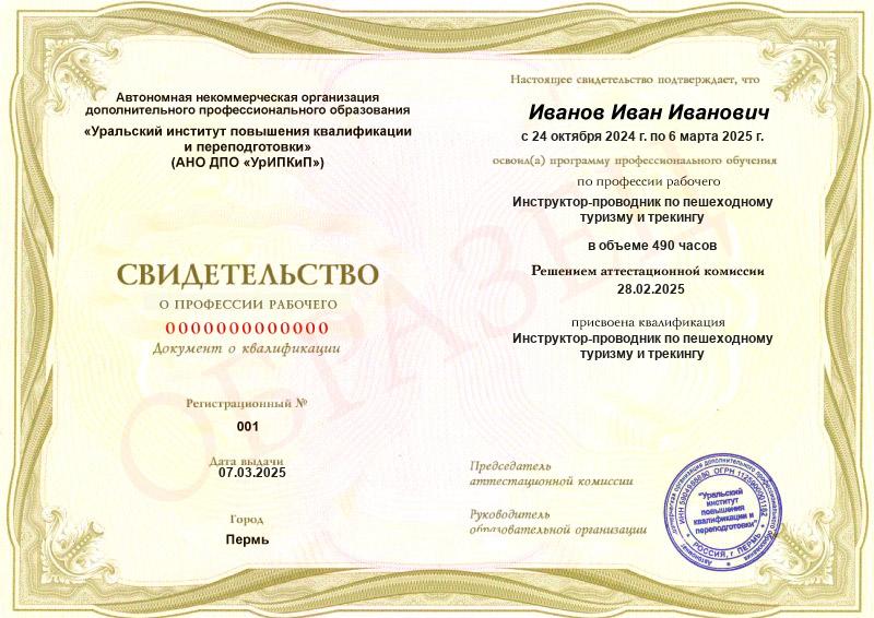 Профессиональный инструктор может организовывать походы разной сложности и выполнять обязанности сопровождающего только после аттестации. Чтобы пройти ее, нужно иметь диплом о высшем или среднем профессиональном образовании либо иной документ, подтверждающий профильное обучение. К таким относится диплом о профпереподготовке, удостоверение о повышении квалификации, свидетельство об окончании курсов.